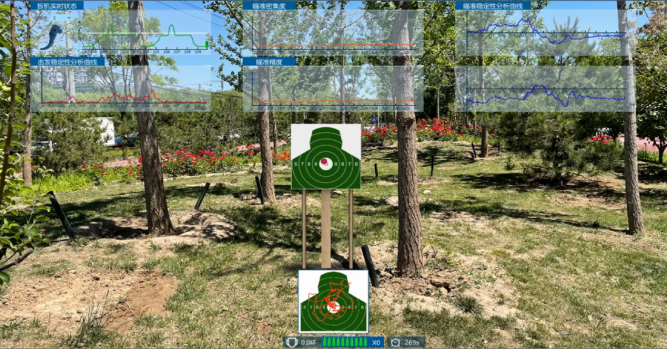 内置无线通讯设备,与其他部件快速稳定链接,满足10-100米使用要求,最大作用距离≥200米;配合图像计算技术实现0.1环高精度报靶;报靶延时:≤100ms;可设置一靶、多靶的模式。