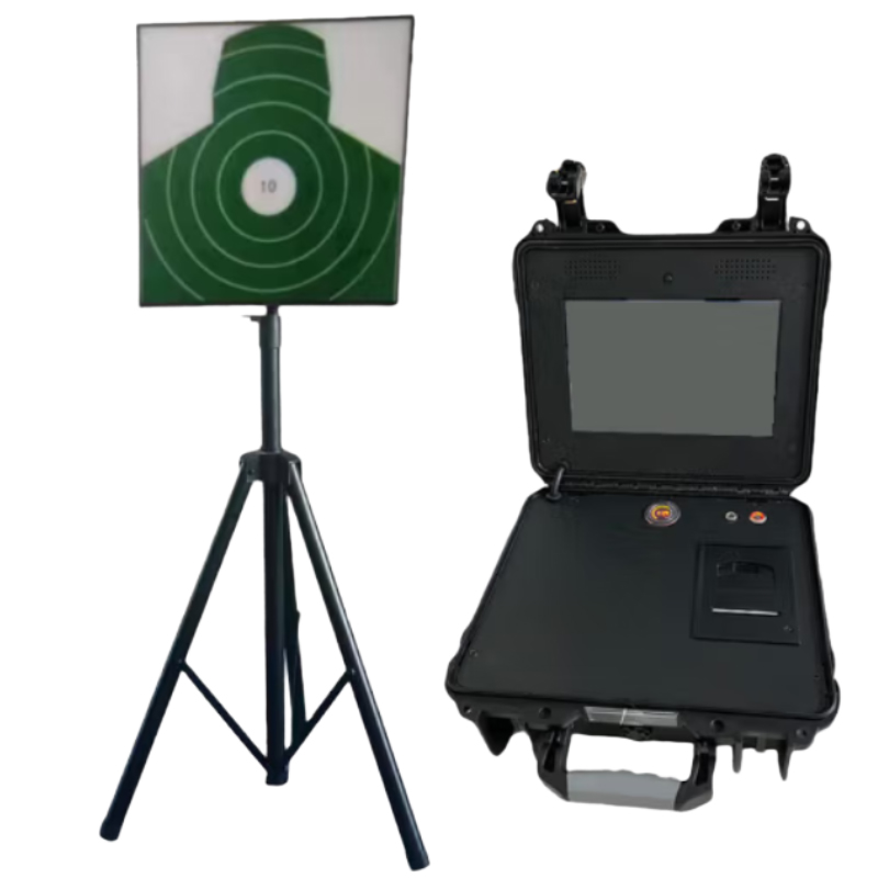 整体组成:合金靶箱、合金支架、激光感应阵列、内置锂电池(电池单次工作时间24h)、无线通讯模组等组成,无需基站,满足200米内即设即用要求(实测)。实时采集轨迹及着点位置至报靶终端,识别延时:≤100ms,识别精度:0.1环;通讯方式:2.4GHz专用通讯网络。